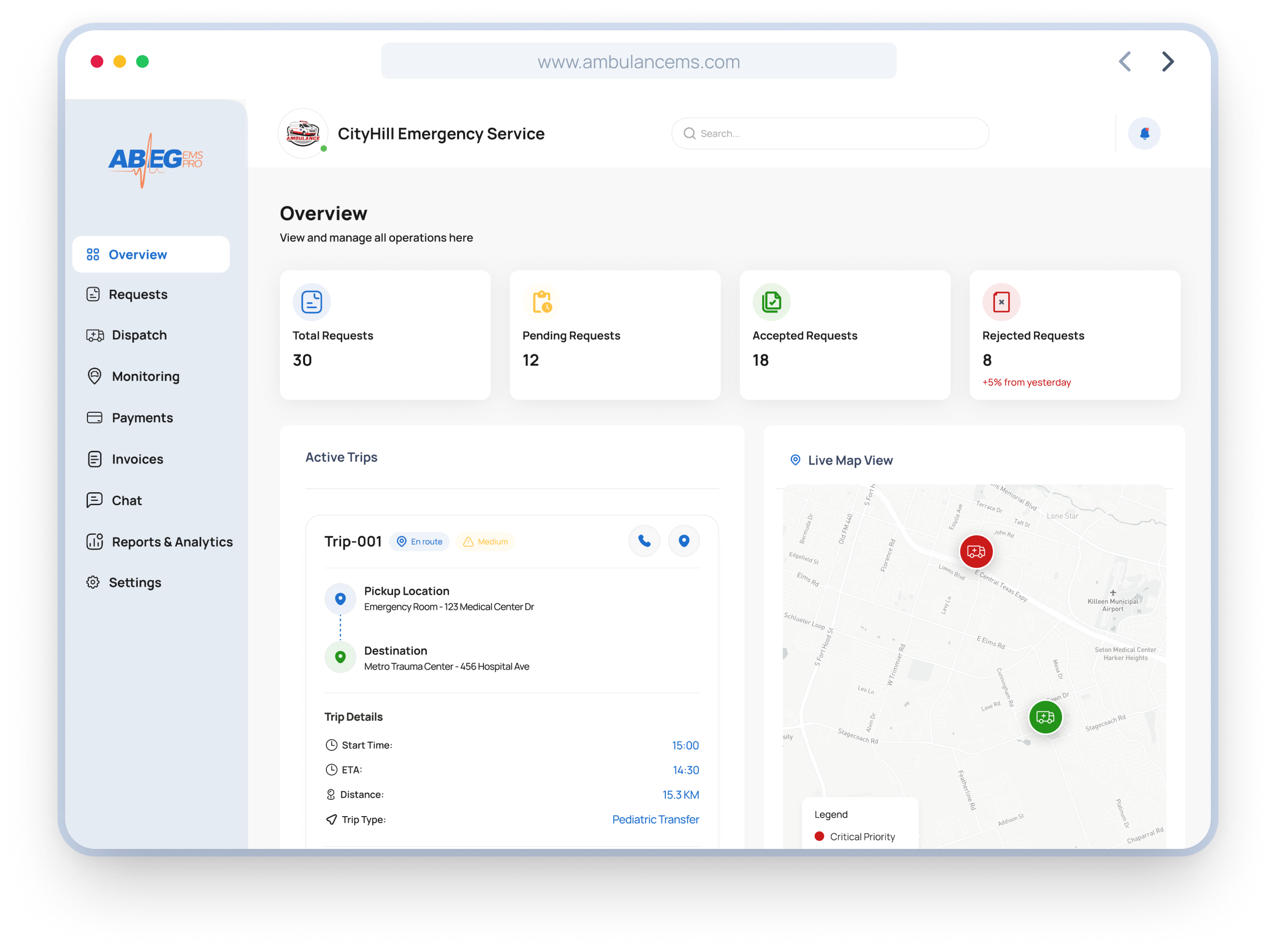 ABEG EMS Pro is a comprehensive B2B software platform that streamlines and modernizes emergency medical logistics. We provide a unified system that connects dispatch centres, ambulance fleets, and hospital emergency rooms in real-time.